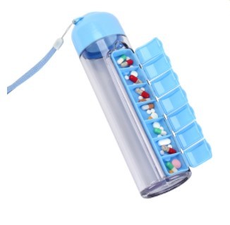 Combine your daily pill box organizer with your water bottle. The new, sleek "in style" pill organizer and water bottle is a great change from your ordinary daily medicine/pill box. The Asobu Pill Organizer Water Bottle holds 20 ounces of your favorite drink, plus features a built-in pill organizer with separate compartments for each day of the week. Hand wash.